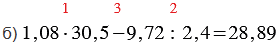 б) 1,08 • 30,5 - 9,72 : 2,4.