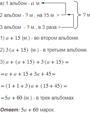 а) У Игоря 3 альбома с марками. В первом альбоме марок, во втором - на 15 марок больше, чем в первом, а в третьем - втрое больше, чем во втором. Сколько марок в трёх альбомах?