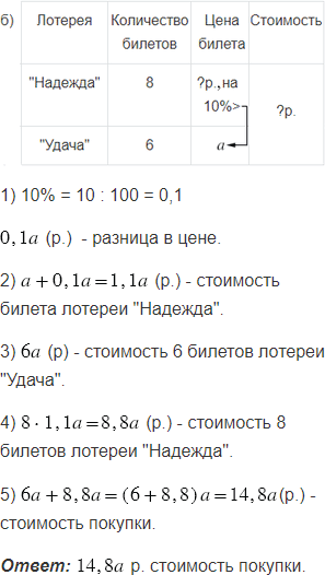 б) Пётр приобрёл 8 билетов лотереи "Надежда" и 6 билетов лотереи "Удача". Билет лотереи "Удача" стоил р., а лотереи "Надежда" был на 10% дороже. Найдите стоимость покупки.