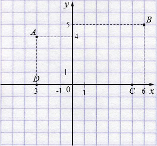 Отметьте на координатной плоскости точки А(-3; 4), В(6; 5), С(5; 0), D(-3; 0).