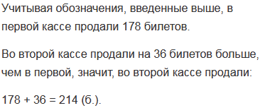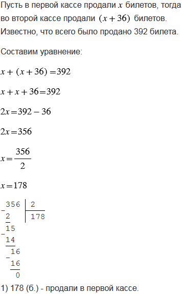 В одной кассе кинотеатра продали на 36 билетов больше, чем в другой. Сколько билетов продали в каждой кассе, если всего было продано 392 билета?