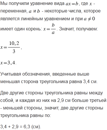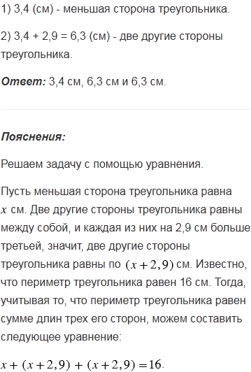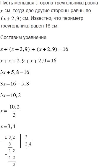 Периметр треугольника равен 16 см. Две его стороны равны между собой, и каждая из них на 2,9 см больше третьей. Каковы стороны треугольника?