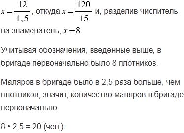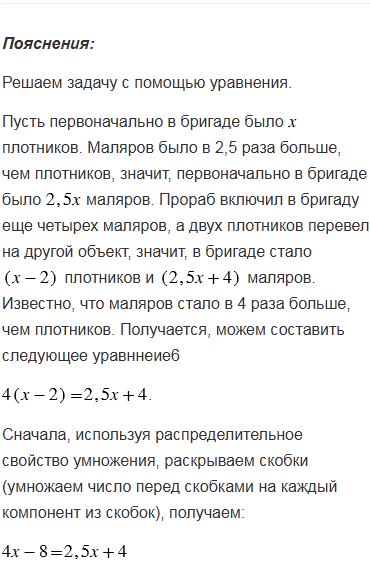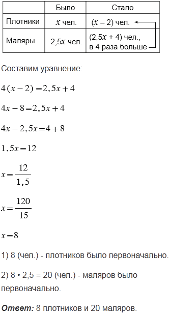 Для ремонта школы прибыла бригада, в которой было в 2,5 раза больше маляров, чем плотников. Вскоре прораб включил в бригаду еще четырех маляров, а двух плотников перевел на другой объект. В результате маляров в бригаде оказалось в 4 раза больше, чем плотников. Сколько маляров и сколько плотников было в бригаде первоначально?
