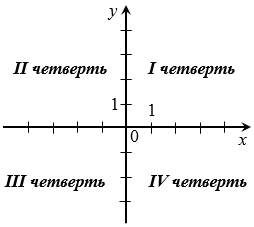 б) Координатные оси разбивают плоскость на четыре части, которые называют координатными четвертями и нумеруют так, как показано на рисунке ниже.
