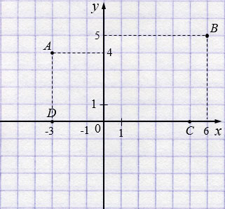 а) Отметьте на координатной плоскости точки А(-3; 4), В(6; 5), С(5; 0), D(-3; 0).