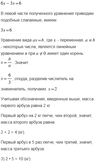Один арбуз на 2 кг легче, чем другой, и в 5 раз легче, чем третий. Первый и третий арбузы вместе в 3 раза тяжелее, чем второй. Найдите массу каждого арбуза.
