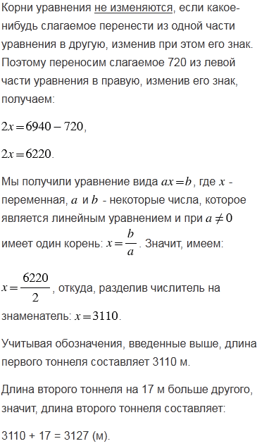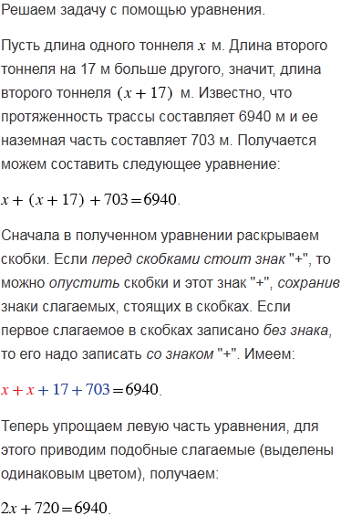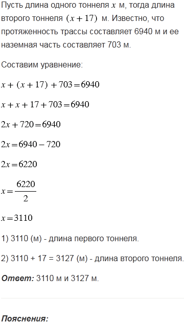 Протяженность автомобильной трассы составляет 6940 м. Большую часть трассы занимают два тоннеля, длина одного из которых на 17 м больше другого. Найдите длину каждого тоннеля, если наземная часть трассы составляет 703 м.