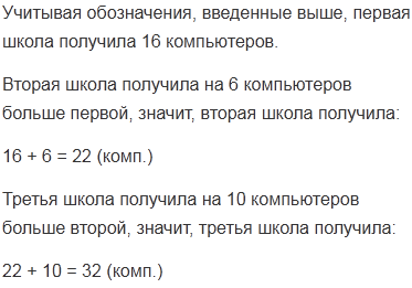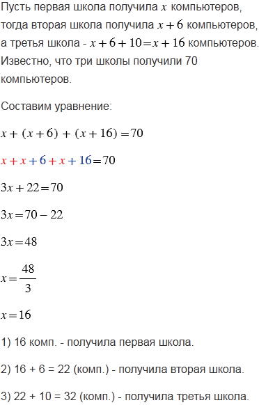 Три школы получили 70 компьютеров. Вторая школа получила на 6 компьютеров больше первой, а третья - на 10 компьютеров больше второй. Сколько компьютеров получила каждая школа?
