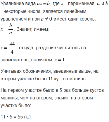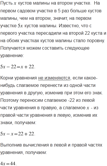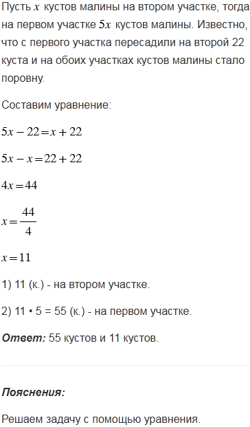 На одном садовом участке в 5 раз больше кустов малины, чем на другом. После того как с первого участка пересадили на второй 22 куста, на обоих участках кустов малины стало поровну. Сколько кустов малины было на каждом участке?