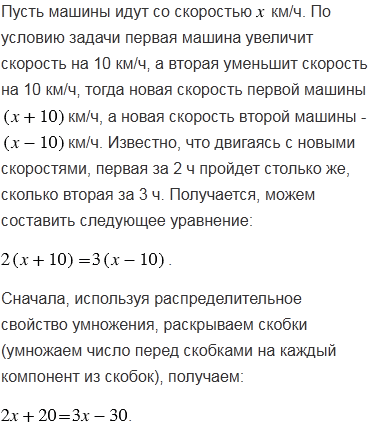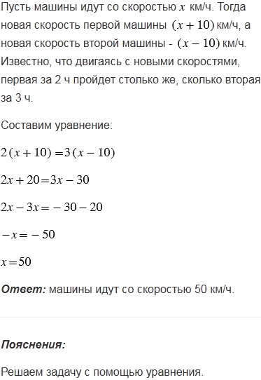 По шоссе идут две машины с одной и той же скоростью. Если первая увеличит скорость на 10 км/ч, а вторая уменьшит скорость на 10 км/ч, то первая за 2 ч пройдет столько же, сколько вторая за 3 ч. С какой скоростью идут автомашины?