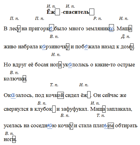 Вдруг ёж_ развернулся и быстро засеменил навстречу зме_. Гадюка кинулась на него. Но ёж_ ловко п_дставил ей к_лючки. Гадюка страшно заш_пела, пов_рнулась и х_тела упол_ти от него. Ёж_ бросился за ней, схв_тил зубами позади головы и наступил ей на спину лапками.