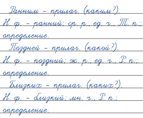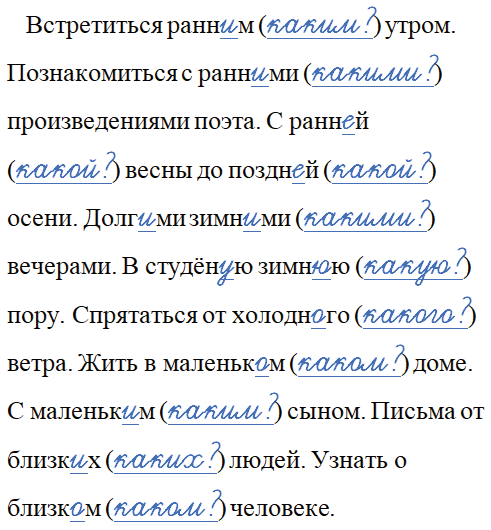 Встретиться ранн_м (______) утром. Познакомиться с ранн_ми (______) произведениями поэта. С ранн_й (______) весны до поздн_й (______) осени. Долг_ми зимн_ми (______) вечерами. В студён_ю заимн_ю (______) пору. Спрятаться от холодн_го (______) ветра. Жить в маленьк_м (______) доме. С маленьк_м (______) сыном. Письма от близк_х (______) людей. Узнать о близк_м (______) человеке.