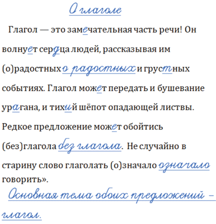 Глагол — это зам_чательная часть речи! Он волну_т сер_ца людей, рас_казывая им (о)радостных __________ и грус_ных событи_х. Глагол мож_т передать и бушевание ур_гана, и тих_й шёпот опадающей листвы. Редк_е предложение мож_т обойтись (без)глагола __________. Не случайно в старину слово глаголать (о)значало __________ гов_рить».