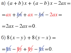 При доказательстве мы использовали распределительное свойство умножения при раскрытии скобок, а именно умножали число, стоящее перед скобками на каждый компонент из скобок. Затем использовали то, что сумма противоположных выражений равна нулю (в решении противоположные слагаемые мы вычеркнули).