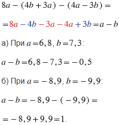 При упрощении выражений сначала раскрываем скобки, учитывая то, что если перед скобками стоит знак "минус", то скобки можно опустить, изменив знак каждого слагаемого, заключенного в скобки, на противоположный. Затем в выражении приводим подобные слагаемые (в решении подобные слагаемые выделены одинаковым цветом).