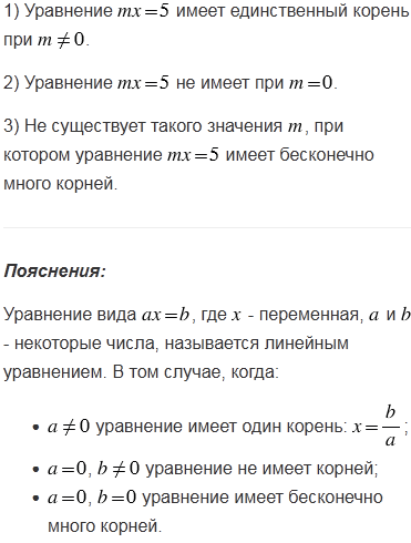 При каких значениях коэффициента \(m\) уравнение \(mx=5\) имеет единственный корень? Существует ли такое значение \(m\), при котором это уравнение не имеет корней? имеет бесконечно много корней?