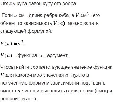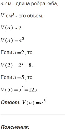 Объем куба зависит от длины его ребра. Пусть \(a\) см - длина ребра куба, а \(V\) см3 - его объем. Задайте формулой зависимость \(V\) от \(a\). Возьмите два каких-либо значения аргумента и вычислите соответствующие им значения функции.