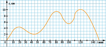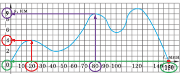 По озеру плавала яхта. Расстояние\(s\) (в километрах), на которое удалялась яхта от базы, менялось с течением времени движения \(t\) (в минутах). Изменение \(s\) в зависимости от \(t\) показано на рисунке 9. На каком расстоянии от базы находилась яхта через 20 мин? через 1 ч 20 мин? через 2 ч 30 мин? Какова область определения рассматриваемой функции?