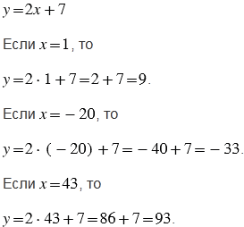 Функция задана формулой = 2 + 7. Найдите значение функции, соответствующее значению аргумента, равному 1; -20; 43.