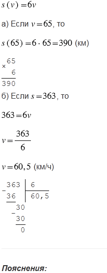 Двигаясь со скоростью \(v\) км/ч в течение 6 ч, автомобиль прошёл путь \(s\) км. Задайте формулой зависимость  \(s\) от  \(v\). Пользуясь этой формулой: