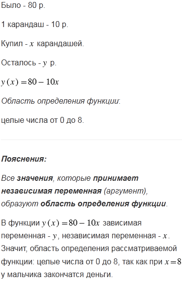 У мальчика было 80 р. Он купил карандашей по 10 р. за штуку. Обозначив число рублей, оставшихся у мальчика, буквой , задайте формулой зависимость от . Какова область определения этой функции в соответствии условием задачи?