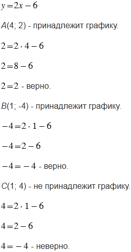 Принадлежат ли точки А(4; 2), В(1; -4) и С(1; 4) графику функции,заданной формулой \(y=2x-6\)? Укажите две точки, одна из которых принадлежит этому графику, а другая нет.