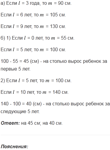 б) 1) Если \(l\) = 0 лет, то \(m\) = 55 см.