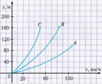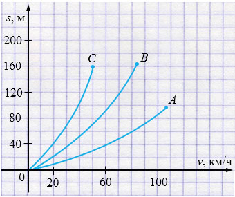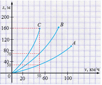 . Точка пересечения этого перпендикуляра с графиком функции ОА имеет координаты (50; 30), с графиком функции ОВ - (50; 70), с графиком функции ОС - (50; 160). Значит, тормозной путь автомобиля при скорости 50 км/ч: