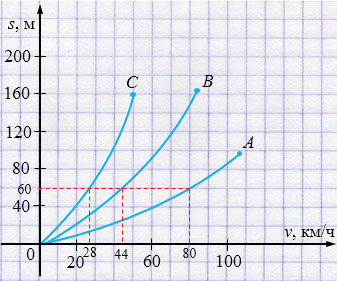 . Эта прямая пересекает график функции ОА в точке с координатой (80; 60), график функции ОВ в точке с координатой (44; 60), график функции ОС в точке с координатой (28; 60). Значит, чтобы тормозной не превышал 60 м, автомобиль должен двигаться: