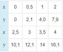 Турист вышел из города и через \(x\) ч находился на расстоянии \(y\) км от него. Зависимость \(y\) от \(x\) показана в таблице:
