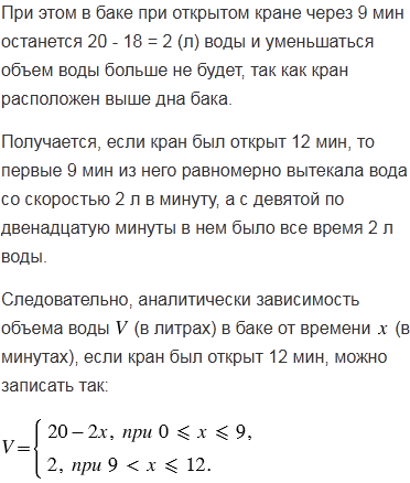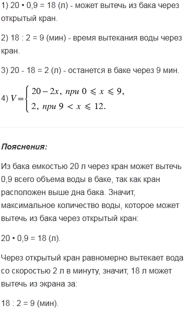 Из бака емкостью 20 л, заполненного водой (рис. 62) через открытый кран равномерно вытекает вода со скоростью 2 л в минуту. Через кран может вытечь 0,9 всего объема воды в баке, так как кран расположен выше дна бака. Объем воды