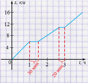 в) По оси времени 1 ч - это 3 клетки, при этом 1 ч = 60 мин, значит, 1 клетка - это 20 мин, так как 60 : 3 = 20. Привалы - это горизонтальные участки графика, следовательно, на первый привал турист затратил 30 мин, на второй привал - 20 мин.