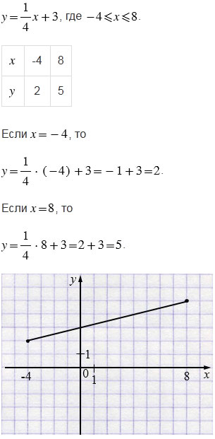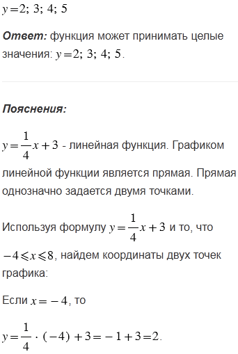 Функция задана формулой \(y=\frac14x+3\), где \(-4\le {x} \le 8\). Постройте график этой функции. И укажите все целые значения, которые может принимать эта функция.