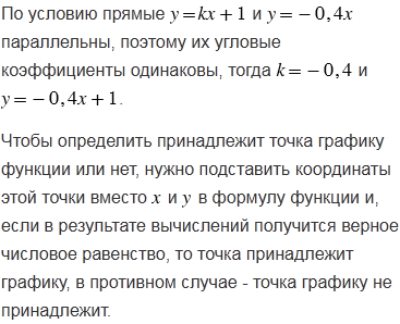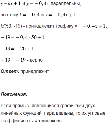 График некоторой линейной функции, заданной формулой вида \(y=kx+1\), параллелен графику функции \(y=-0,4x\). Найдите значение коэффициента \(k\) и выясните, принадлежит ли этому графику точка М(50; -19).