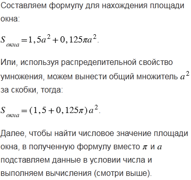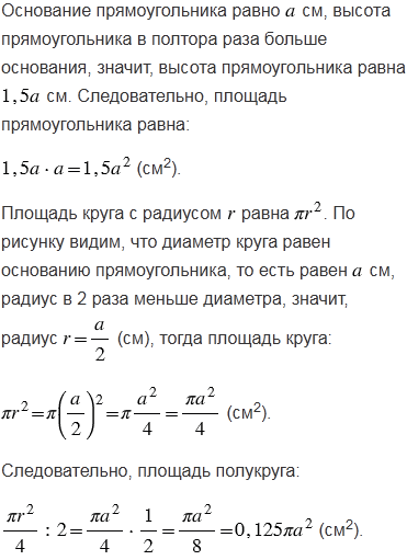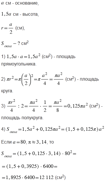 Окно в старинном особняке имеет форму прямоугольника, завершающегося полукругом (рис. 72). Составьте формулу для вычисления его площади (в квадратных сантиметрах), если известно, что основание прямоугольника равно см, высота прямоугольника в полтора раза больше основания. Найдите площадь окна, если = 80. (Указание. Площадь круга равна , где - радиус круга, 3,14.)