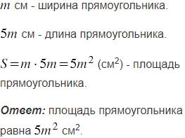 Площадь прямоугольника равна произведению смежных его сторон (ширины и длины). При этом полученный одночлен стоит записать в стандартном виде.