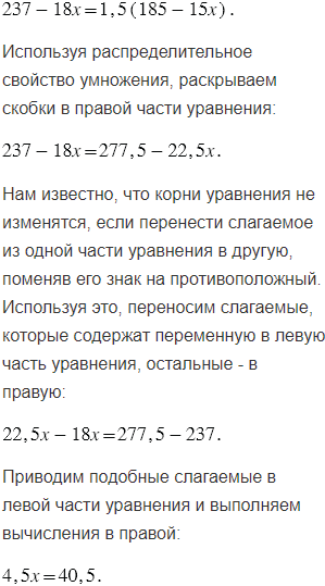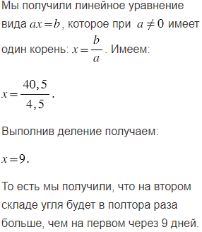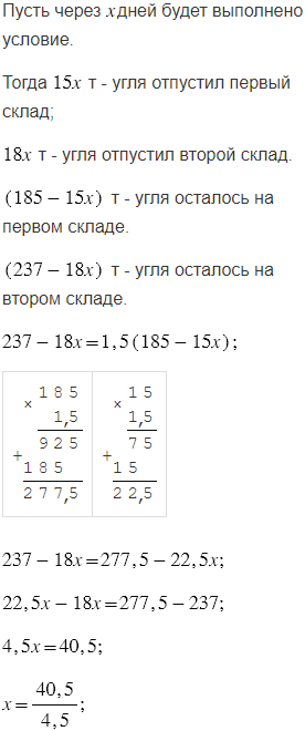 На одном складе было 185 т угля, а на другом - 237 т. Первый склад стал отпускать ежедневно по 15 т угля, а второй - по 18 т. Через сколько дней на втором складе угля будет в полтора раза больше, чем на первом?