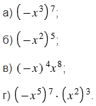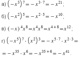При возведении отрицательного числа в степень с чётным показателем получаем положительное число, а при возведении отрицательного числа в степень с нечётным показателем получаем отрицательное число. При этом обращаем внимание на то, что на минус, стоящий перед скобками, показатель степени не влияет, на минус, стоящий в скобках, влияет только тот показатель степени, который стоит за скобками.