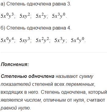 Многочлен, состоящий из одночленов стандартного вида, среди которых нет подобных, называют многочленом стандартного вида. Если одночлен представлен в виде произведения числового множителя, который стоит на первом месте, и степеней с различными основаниями, то его называют одночленом стандартного вида. Чтобы представить одночлены в стандартном виде перемножают числа с числами и степени с одинаковыми основаниями, учитывая то, что при умножении степеней с одинаковыми основаниями основание оставляют прежним, а показатели степени складывают.