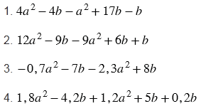 Чтобы определить, какой многочлен, тождественно равен выражению , нужно в каждом из данных многочленов привести подобные члены. Подобные слагаемые в многочлене называют подобными членами многочлена, а приведение подобных слагаемых в многочлене - приведением подобных членов многочлена. Подобные слагаемые - это слагаемые, которые имеют одинаковую буквенную часть, т.е. подобные слагаемые могут отличаться только коэффициентами (в решении подобные слагаемые выделены одинаковым цветом). Чтобы сложить (или привести) подобные слагаемые, надо сложить их коэффициенты и полученный результат умножить на общую буквенную часть.
