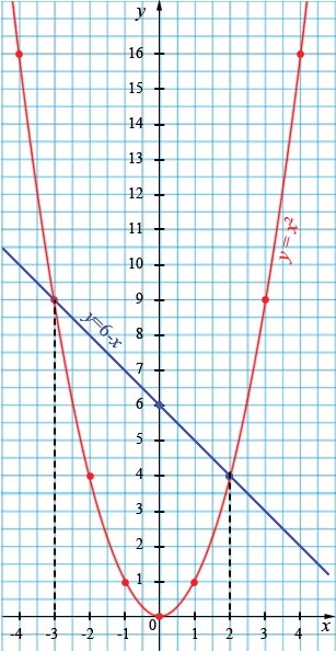 3.  Эти графики пересекаются в двух точках. Абсциссы точек пересечения графиков являются теми значениями переменной \(x\), при которых выражения \(x^2\) и \(6-x\) принимают равные значения. Значит, абсциссы точек пересечения являются корнями уравнения \(x^2=6-x.\)
