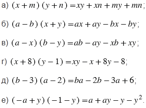 Чтобы умножить многочлен на многочлен, можно каждый член одного многочлена умножить на каждый член другого и полученные произведения сложить (мы говорим об алгебраической сумме - выражение, которое можно представить в виде суммы положительных и отрицательных чисел).