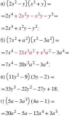 Чтобы умножить многочлен на многочлен, можно каждый член одного многочлена умножить на каждый член другого и полученные произведения сложить (мы говорим об алгебраической сумме - выражение, которое можно представить в виде суммы положительных и отрицательных чисел). В решении выделены одинаковым цветом подобные слагаемые, их мы складываем (вычитаем), тем самым упрощая выражение.