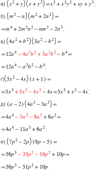 Также, выполняя умножение многочлена на многочлен, помним, что при умножении степеней с одинаковыми основаниями показатели степени складывают, а основание оставляют тем же.