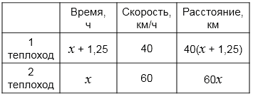 2. Учёт запаздывания старта второго теплохода: первый идёт на \(1,25\) ч дольше.