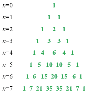 Для определения коэффициентов получаемого многочлена, используют треугольник Паскаля. В треугольнике Паскаля "боковые стороны" состоят из единиц, а каждое из остальных чисел равно сумме двух чисел, записанных над ним.
