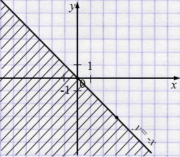 б) \(y \le -x\): прямая \(y=-x\) — граница. Штриховка области под и на этой прямой (слева-внизу). Точки на прямой включаются.