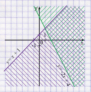 в) Границы: прямая \(y=-2x+4\) и прямая \(y=x+1\). Для «\(\ge\)» у первой — штриховка над или на \(y=-2x+4\). Для «\(\le\)» у второй — штриховка под или на \(y=x+1\). Область — перекрытие двух полуплоскостей, включая границы.