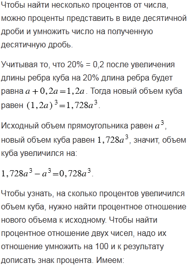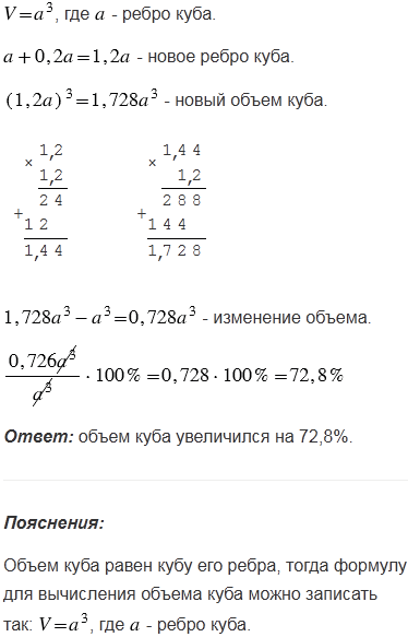 Как изменится объем куба, если длину его ребра увеличить на 20%?