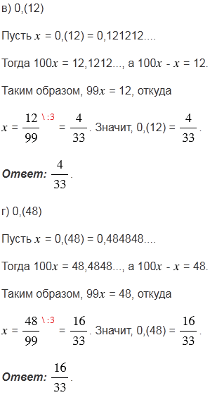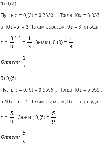 Образец: Пусть = 0,(7) = 0,7777.... Тогда 10 = 7,777..., а 10 - = 7. Таким образом, 9 = 7, откуда = . Значит, 0,(7) = .